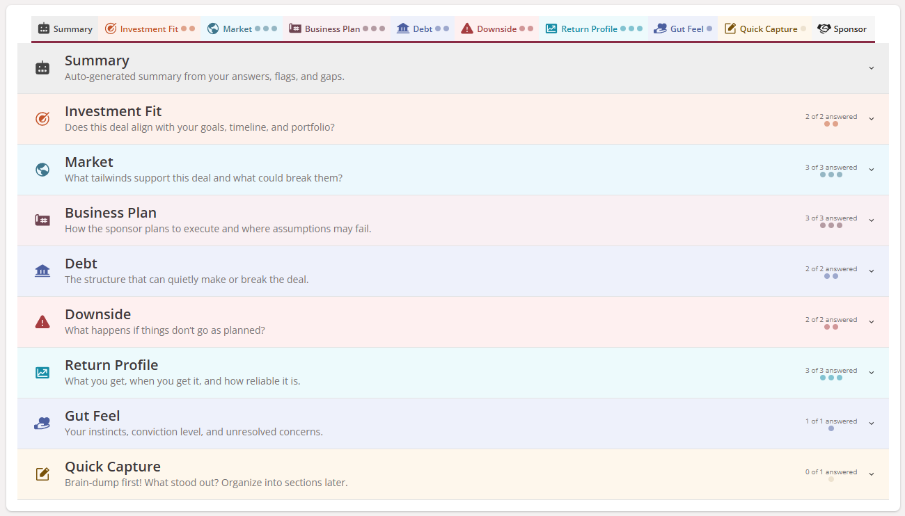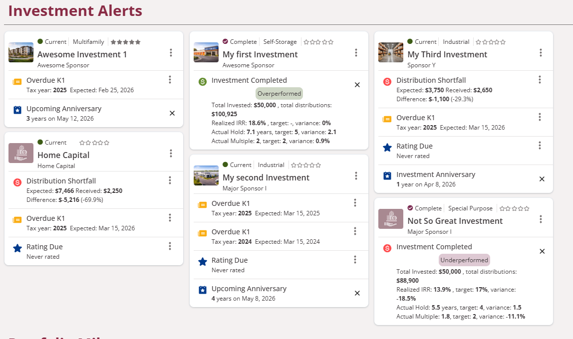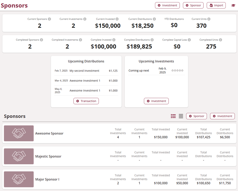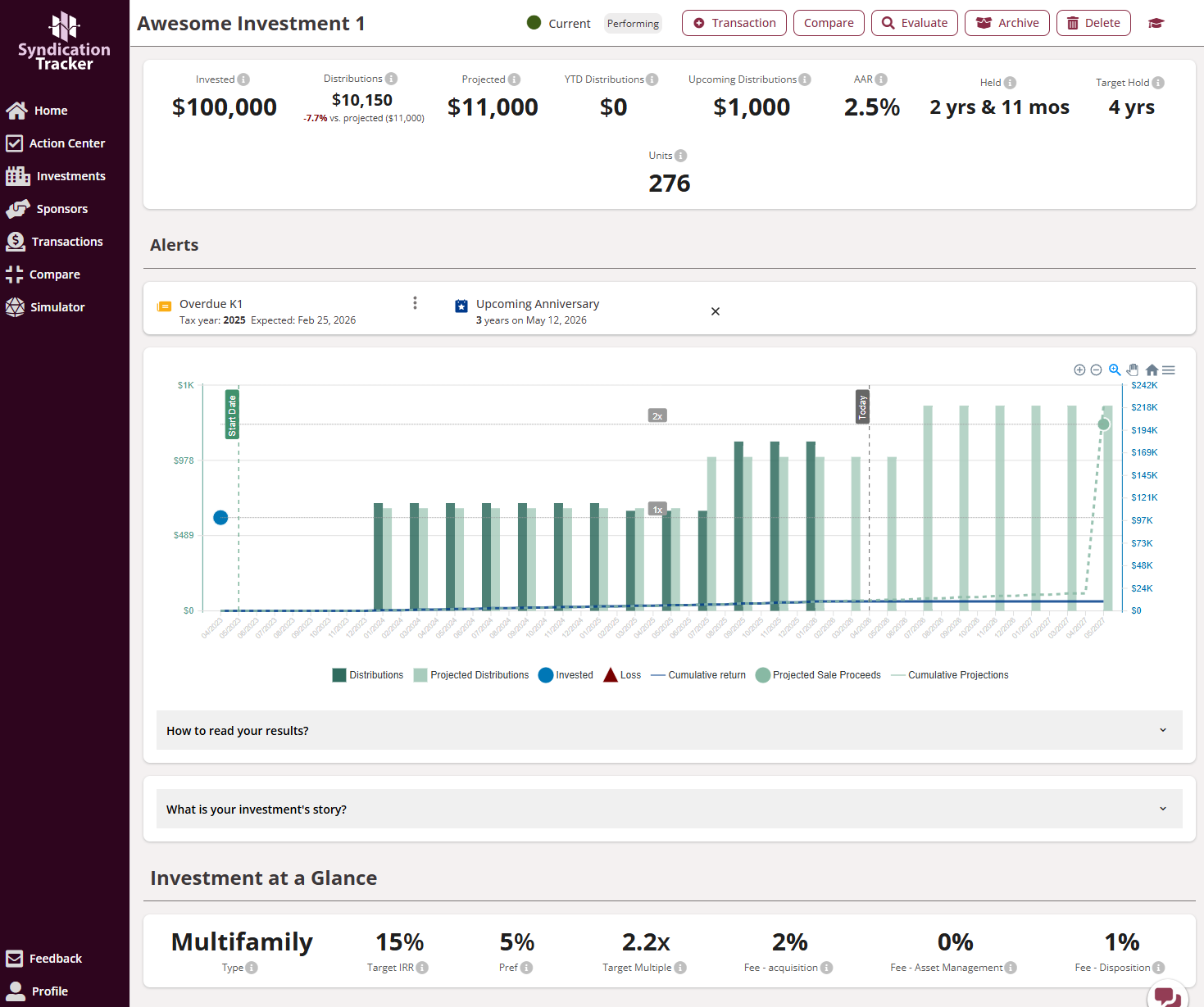 That’s why we created Syndication Tracker: a dedicated platform that puts you in control of your investment journey. No sponsor interference, no sales pitches, no scattered information—just a clear, comprehensive view of your portfolio paired with powerful evaluation tools.