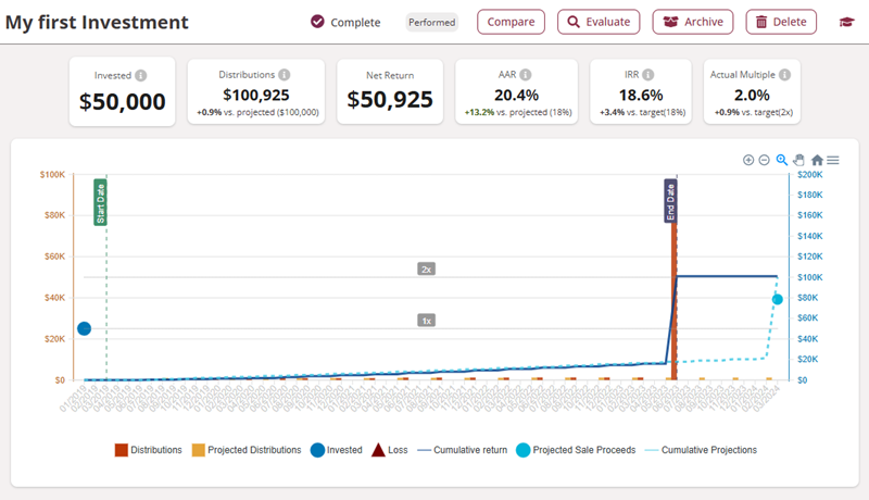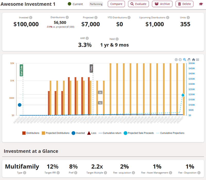 Compare actual versus projected performance with AAR, IRR, equity multiples, and distribution tracking.