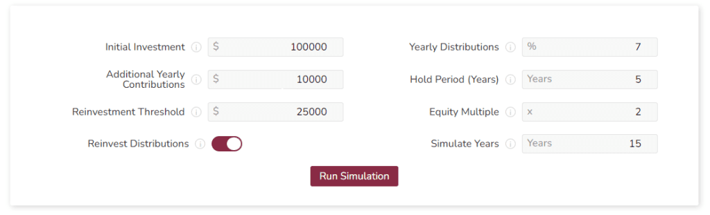We all need to start somewhere – this is the amount of your initial investment. This can be any amount you want to run a simulation on. A few notes – typically, a minimum investment in syndication will be $25K-$50K. Also, the larger your initial investment is, the larger your distributions, and the sooner you are likely to be able to reinvest (if Reinvest Distributions is “On”).