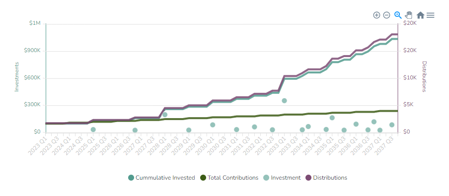You will see two vertical axis – one dedicated to the investments (Cummylative Invested, Total Contributions, and Investment) and one for Distributions. We have split them because it is harder to distinguish the growth of the distribution when the amounts are so much lower than the cumulative Invested.